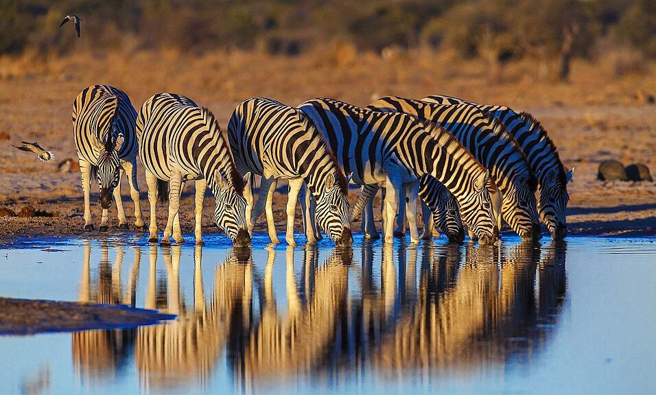 Der Etosha-Nationalpark ist ein 22'935 km² grosser Nationalpark im Norden von Namibia und bedeutendstes Schutzgebiet des Landes. Der Park liegt am Nordwestrand des Kalahari-Beckens und umfasst fast die gesamte 4760 km² grosse Etosha-Pfanne. Der abwechslungsreiche Etosha Nationalpark bietet wegen seiner offenen Vegetation ideale Bedingungen für Tierbeobachtungen. Die Wasserstellen, wie zum Beispiel Newbronii und Okondeka, bieten die besten Möglichkeiten, um Elefanten, Nashörner, Giraffen, Zebras und vielleicht auch Löwen, Leoparden oder andere Raubtiere zu beobachten und zu fotografieren, die hier ihren Durst stillen. Eine Besonderheit sind die verschiedenen Antilopenarten, unter anderem das Eland, die grösste Antilope, und das Damara Dikdik, die Kleinste. In Olifantsbad gibt es sogar einen umzäunten kleinen Hügel, wo Sie im Gegensatz zu den anderen Wasserstellen aussteigen können. Aus sicherer Entfernung können Sie von hier aus Tiere beobachten und ein wenig umherlaufen. Sie verlassen heute die Etosha Safari Lodge und fahren zur Mokuti Lodge durch den Etosha National Park. Das Abendessen wird Ihnen in der Mokuti Lodge serviert.