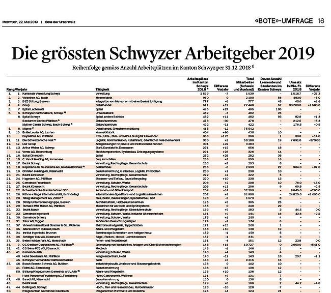 Jedes Jahr im Sommer veröffentlicht der «Bote» die Statistik «Die grössten Unternehmen im Kanton Schwyz». Darauf werden die aktuellen Mitarbeiterzahlen der Unternehmen mit den Vorjahres-Zahlen verglichen. Die Statistik zeigt auf, wie sich die Arbeitsplätze im Kanton Schwyz entwickeln.