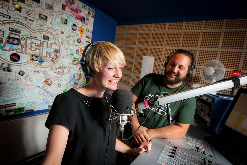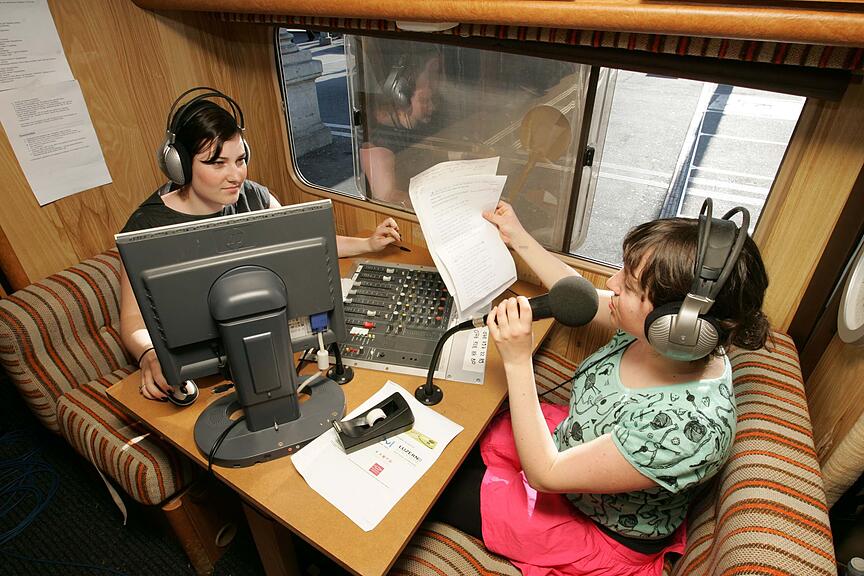Im Mai 2008 sendete das Radio eine Woche lang vom Bahnhofplatz aus. Im Bild: Moderatorin Vera Rigert (links) und Carla Keller (rechts).