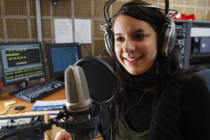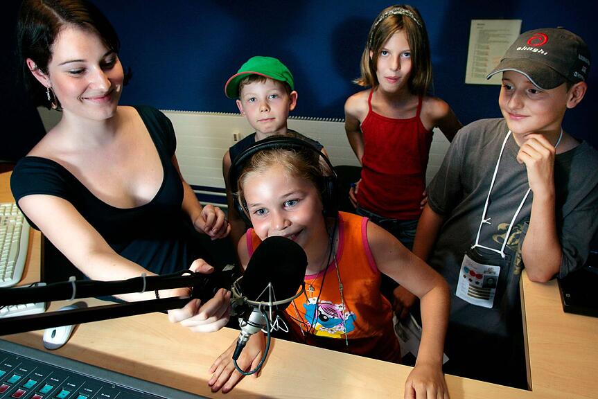 Unterwegs mit dem Ferienpass: Kinder erkunden mit Moderatorin Vera Rigert das Studio.