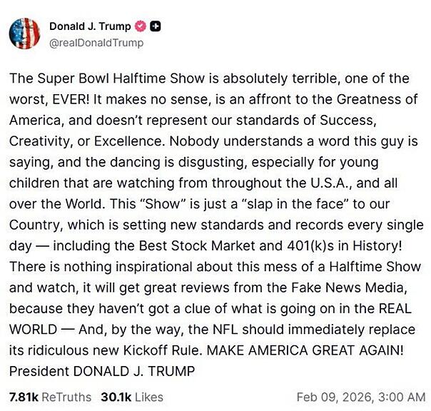 Traditionell beschwört die Halbzeitshow beim Super Bowl eigentlich den Gemeinschaftssinn von Millionen US-Amerikanern - zumal das Land derzeit so tief gespalten ist wie vielleicht noch nie. Präsident Trump, der dem Super Bowl diesmal selbst fernblieb, setzte aber einen anderen Akzent. Er bezeichnete den Pausenauftritt direkt im Anschluss auf der Plattform Truth Social als «Schlag ins Gesicht» für die USA und als eine der schlechtesten Halbzeitshows, die er jemals gesehen habe.