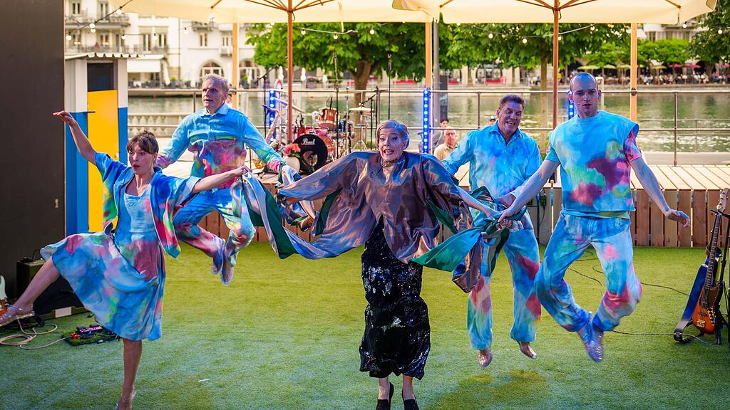 Platsch! Nach dem Köpfler in den Vierwaldstättersee bäuchlings in die Rüüss-Badi. Das ist möglich an diesem Donnerstagabend: Zur Premiere von «baden gehen», des «Liederabends unter freiem Himmel» in der Box des Luzerner Theaters, kann man auch auf einem blau- oder gelbweiss gestreiften Badetuch Platz nehmen. Es ist die letzte Premiere der Saison.