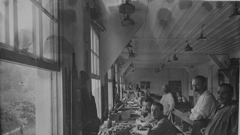 Arbeiter 1913 der Holztypenfabrik Roman Scherer, sogenannte «Eckenschneider».