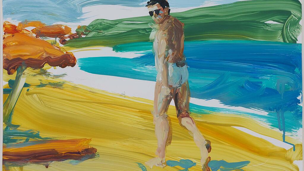 Zufällig läuft uns dieser Mann in Badehose ins Blickfeld. Vor die Linse, würde man sagen, wäre diese Momentaufnahme fotografiert und nicht gemalt. Und doch hat diese Malerei den spontanen Charme eines Schnappschusses. Doppelt gar. Erstens: Der Mann posiert nicht, er geht, schaut sich um – und schon ist er ein Bild. Zweitens durch die Malweise: Strand, Wasser, Pflanze, Hügelzug und Himmel sind mit wenigen einfarbigen Pinselstrichen schwungvoll über das Blatt gezogen. Einzig die Figur bekommt ein bisschen mehr Aufmerksamkeit, bis hin zum Detail der Sonnenbrille. Einige Fehler dürfen aber bleiben.