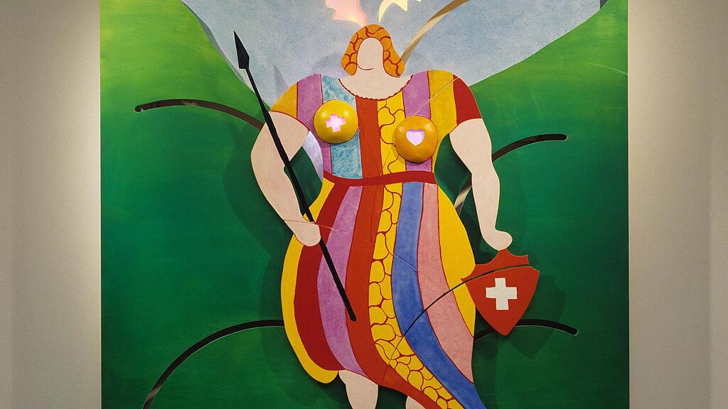 Nein, hier gibts keinen Rütlischwur und keinen Wilhelm Tell zum 1. August, sondern unser weibliches Nationalsymbol. Die Helvetia. Oder wie Niki de Saint Phalle bei ihrem Relief von 1993 titelte, «Miss Helvetica». Bunt gekleidet (fast im Regenbogenlook) steht die Kämpferin im grünen Gras. Speer und Schild wirken zierlich wie Spielzeug, und im Vergleich zu den stämmigen Waden scheint auch der Kopf klein geraten. Dafür sind die Brüste üppige Halbkugeln, mal bekreuzt, mal beherzt – aber ziemlich schief aufgesetzt.