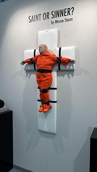 Dabei ist ein Witz nicht zu übersehen: Man kann das Trump-Double als Erlöser lesen, wenn das Kreuz steht. Wenn das Kreuz allerdings horizontal am Boden placiert wird, wirkt die Figur so, als ob der Gefangene auf die Todesspritze warte.