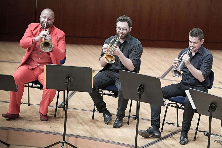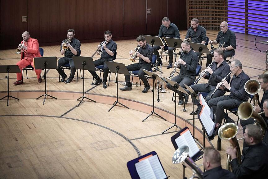 Weich und gefühlvoll spielen Hans Gansch, Trompete, und Alexander Wurz, Tenorhorn, die Soli in «Erinnerungen an Spiro». Und wenn Thomas Gansch in seinem knallroten Anzug quer über die Bühne hüpft, passt auch das zur Musik. In der Pause hört man allenthalben begeisterte Kommentare, die Stimmung ist so quirlig wie die Musik. Dann geht es turbulent zu in «Don Quixote» von Theo Rupprecht. Da wird nicht nur höchst virtuos gespielt, auch geschrien und aufgestanden, die Windmühlen scheinen über alle herzufallen. Und das Publikum klatscht mit.