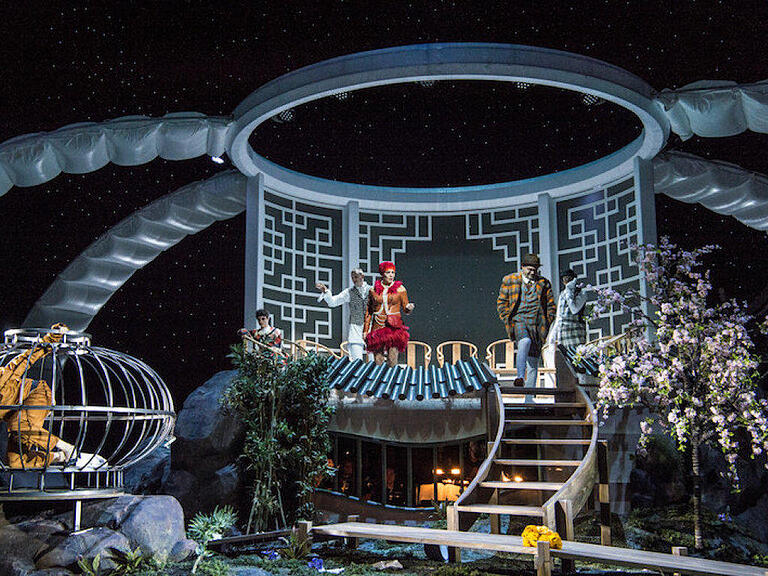 "Heilung durch Katharsis" versprechen ein Arzt und die Klinikleiterin, und stellen die Patienten vor, elf Personen von "Mammon blau" bis "Mammon Rosa". Dann hebt sich der Vorhang, und beinahe entfährt einem ein "Wow": In einem durch krakenhafte Bögen angedeuteten Raumschiff liegt ein japanischer Zen-Garten mit Steinen, Stegen, Pflanzen, Lotus-Teich, Pagoden-Pavillon, Kirschblüten und einem Koi-Fisch, der in einem Käfig (!) seine Runden zieht (Bühnenbild: Jo Schramm).