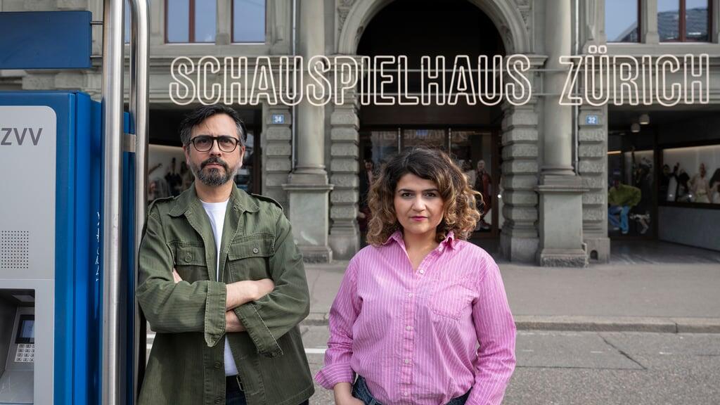 Grosser Saal, wenig Leute: Rafael Sanchez und Pınar Karabulut vor dem Schauspielhaus Zürich.