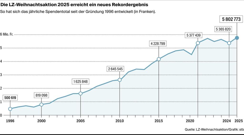 Die LZ-Weihnachtsaktion hat seit ihrer Gründung 1996 rund 92 Millionen Franken gesammelt und rund 69'000 Hilfsgesuche geprüft. Sie ist damit die mit Abstand erfolgreichste Sammlung einer Schweizer Zeitung. Und natürlich geht sie weiter. Spenden kann man das ganze Jahr über, Einzahlungen werden ab sofort der nächsten Sammlung angerechnet, die im November starten wird.