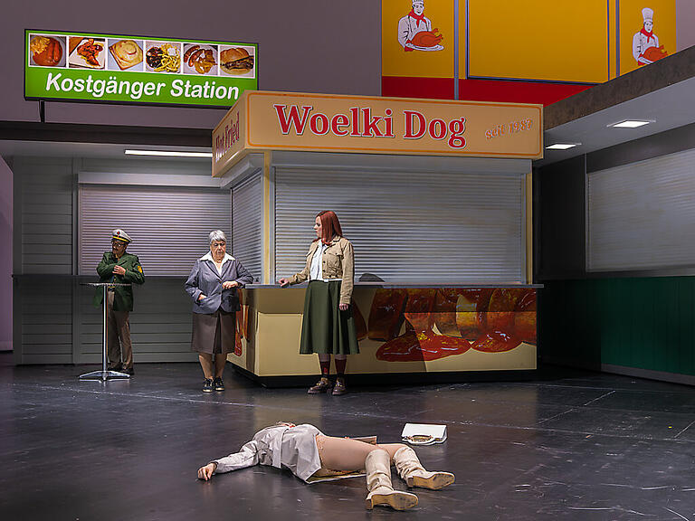 Diese positiven und negativen Erwartungen an eine subversive Szenerie jenseits der Regeln des logischen Denkens werden vollauf erfüllt. Bühnenbildner Duri Bischoff hat eine hinreissende Stadt aus Würstchenbuden auf die Bühne gezaubert, die so zweideutige Namen wie "Woelki Dog" tragen - der Name des umstrittenen Kölner Erzbischofs.