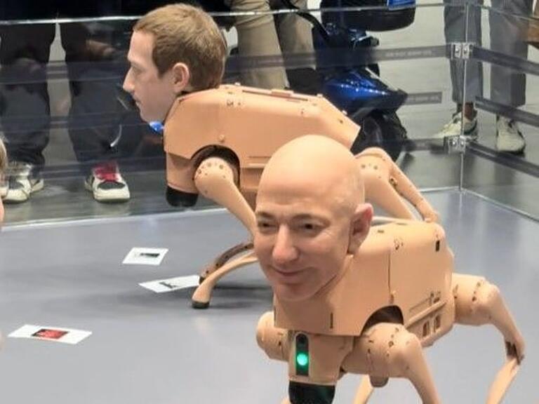 Der Anblick ist mehr als schräg: Roboterhunde mit den Köpfen von Mark Zuckerberg, Jeff Bezos oder Elon Musk staksen durch ein «Gehege». Zu sehen ist das Werk von Künstler Beeple mit dem Titel «Regular Animals» aktuell an der Art Basel in Miami.