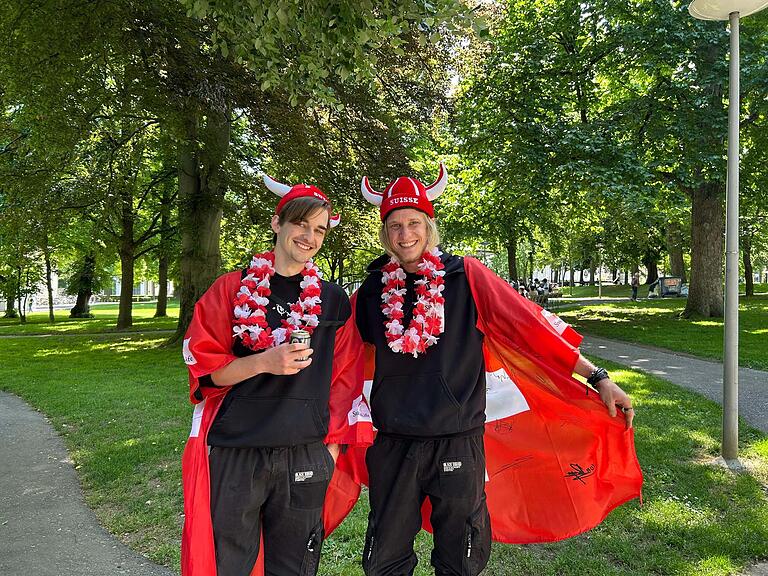 Dieter Leutwyler und Hansjörg Surer sind grosse Schweiz-Fans. Die beiden stammen aus Baselland und sind nach Basel «in die Ferien» gekommen./>