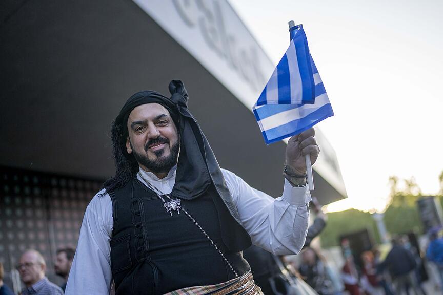 Ein griechischer Fan vor der St. Jakobshalle, kurz vor dem Start des zweiten Halbfinals./>