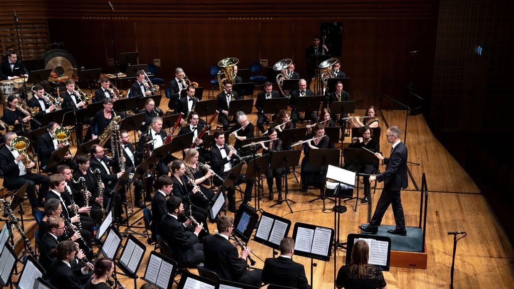 Hervé Grelat dirigiert das zahlreich besetzte Blasorchester Stadtmusik Luzern in der Uraufführung von John Mackey Shakespeare-Sinfonie «The isle is full of noises».