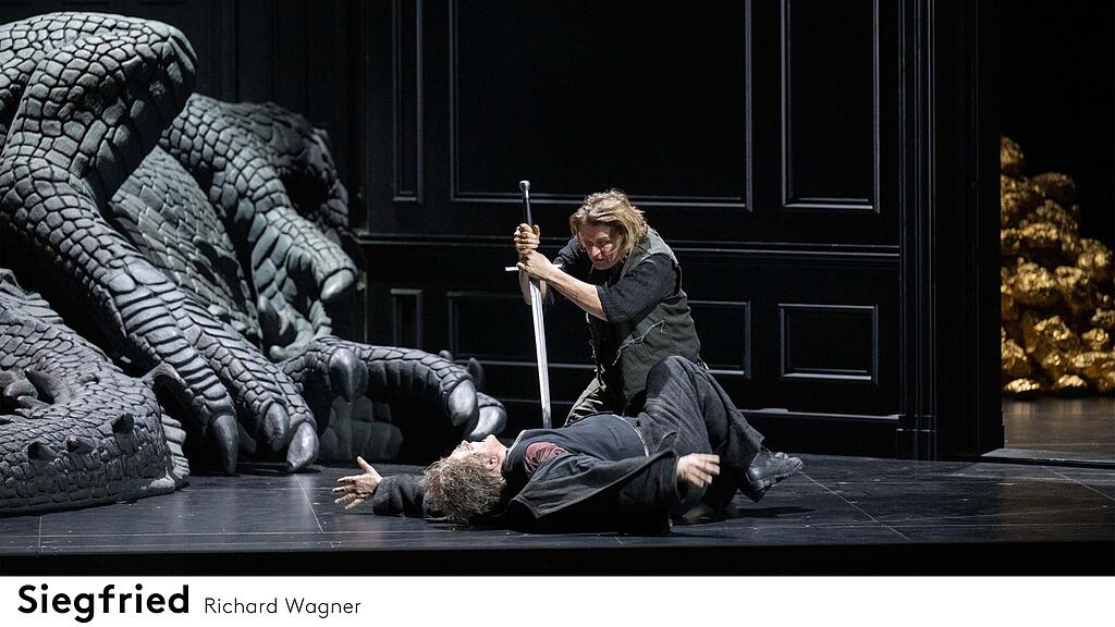 Siegfried (Klaus Florian Vogt) räumt sich den Weg frei, tötet den Drachen und Mime (Wolfgang Ablinger-Sperrhacke) gleich dazu.