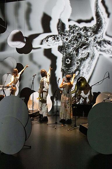 Ein ganzes Universum aus Showbiz-Pomp tut sich auf, wenn Bibi Vaplan und ihre Crew die Bühne entern. Wenn sie ihre Rakete Xalvadora besteigen und im grossen Opernbogen durchs All zischen, auf der Suche nach Planeten, auf denen sie die Essenzen des Glücks jagen, einsammeln und zurück auf die Erde bringen können: Verrücktheit, Kreativität, Sinnlichkeit und Weisheit. Und wenn sie auf Roccobello und Leon treffen, zwei magische Stiere und Hüter des Universums. (sh)