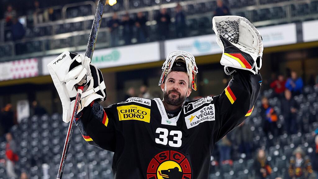 Eishockeygoalie Sandro Zurkirchen lässt sich von den SCB-Fans feiern.