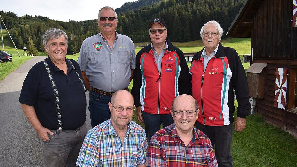 Sie holten am Jahresschiessen einen Podestplatz und waren an der Rangverkündigung zugegen: Hinten von links Bruno Besmer (Zweiter Kategorie D), Edgar Kälin (Sieger Kategorie E), Josef Kälin (Sieger Kategorie A) und Arnold Kälin (Dritter Kategorie A). Vorne von links Josef Trütsch (Dritter Kategorie E) und Anton Staub (Dritter Kategorie D).