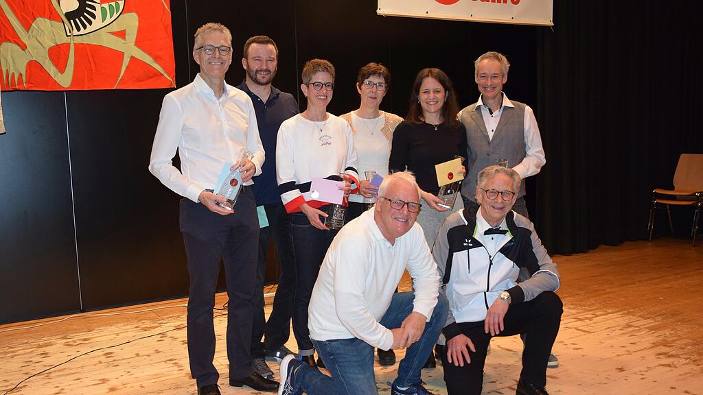 Die sechs neuen Ehrenmitglieder: Andreas Kolb (von links), Matthias Suter, Melanie Bracher, Daniela Dettling, Melissa Kälin und Peter Walther. Vorne: Edwin Kälin und Alois Schibig, welche für ihr aussergewöhnliches Engagement im TSV Steinen ausgezeichnet wurden.