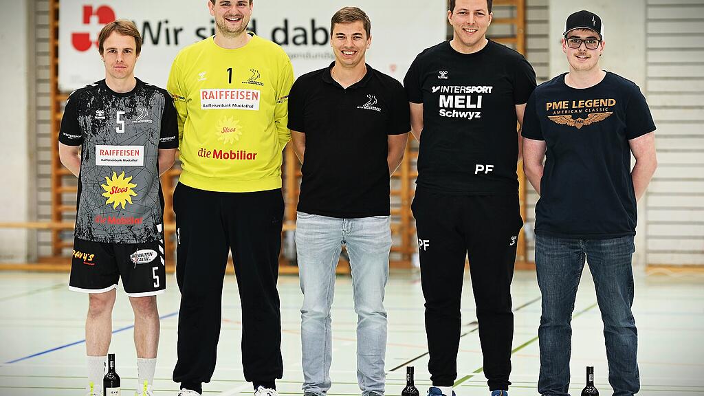 Präsident Philipp Christen (Mitte) verabschiedete Matteo Schelbert (von links), Florian Oechslin, Patrick Föhn und Nico Suter vom Herren 1.