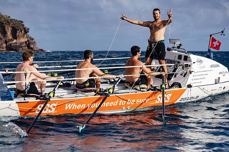 Das Team 44West überquerte den Atlantik von den Kanaren bis in die Karibik und kam nach 31 Tagen, 8 Stunden und 8 Minuten als erstes von 43 Teams ins Ziel. An Board: Der Zürcher Luca Fayd'herbe de Maudave (24), Matthias Fernandez (28) und Lorenzo Henseler (28) aus Zug und Julian Müller (29) aus Merlischachen.