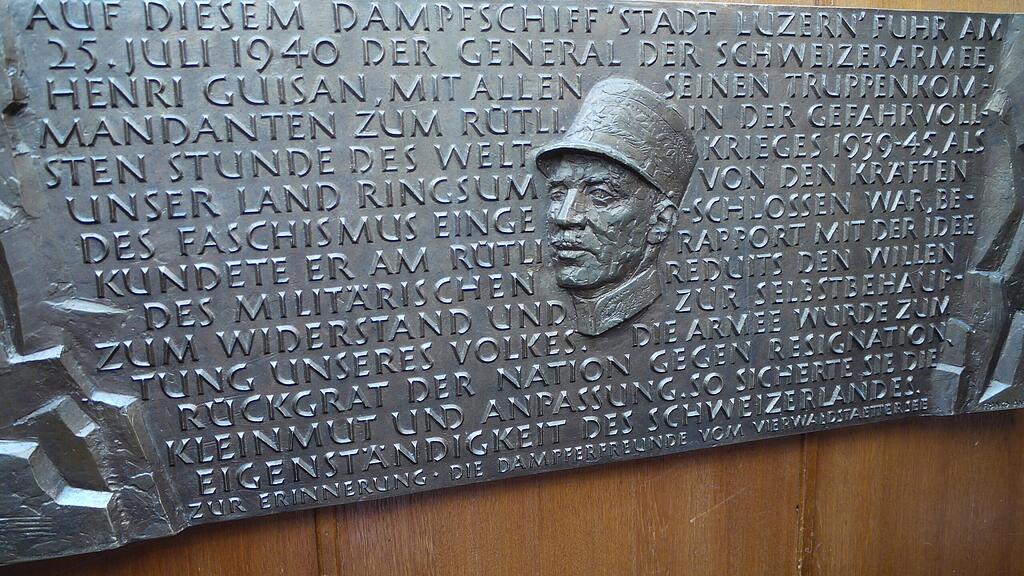 Auf dem Dampfschiff «Stadt Luzern» erinnert diese Gedenktafel an die legendäre Fahrt von General Guisan zum Rütlirapport von 1940.