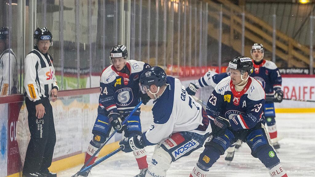 Seewens Marco Waser (Nr. 24) und Mika Burkhalter (Nr. 23) nehmen den Gegner Kenneth Graf, hier im letzten Spiel gegen Lyss, in die Zange.