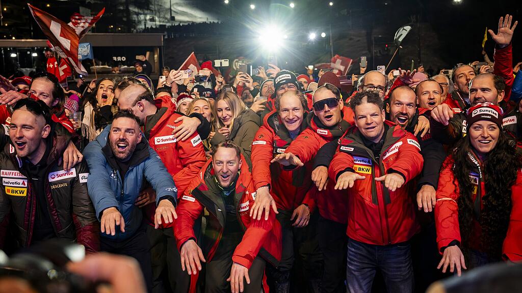 Vitus Lüönd (vorne, Zweiter von links) feierte an der WM mit dem Schweizer Team die Medaillen von Franjo von Allmen und Alexis Monney. Auch er rasierte sich die Haare.