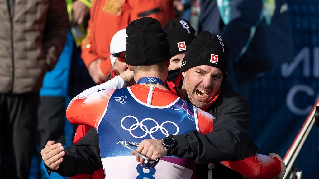 Swiss-Ski-Trainer Vitus Lüönd aus Sattel gratuliert seinem Schützling Franjo von Allmen.