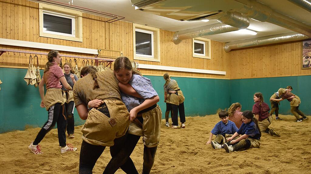 15 Mädchen und Frauen drängen sich um eine Stange voller Zwilchhosen. «Nein, jetzt hat es meine Grösse nicht mehr», sagt die zwölfjährige Ibächlerin Céline Erni. Die Schwingerinnen zanken sich kurz kameradschaftlich, Céline Erni und die anderen können sich dann aber einigen und helfen sich gegenseitig, die Gürtel eng anzuziehen.