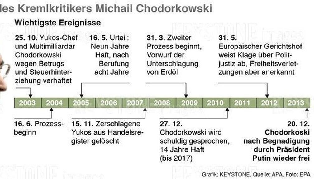 Putin hatte den früheren Ölmagnaten und Chef des inzwischen zerschlagenen russischen Öl-Konzerns Yukos am Freitag nach mehr als zehn Jahren Lagerhaft begnadigt. Chodorkowski wurde umgehend aus dem Gefängnis entlassen und reiste überraschend nach Berlin, wo er vom früheren deutschen Aussenminister Hans-Dietrich Genscher empfangen wurde.