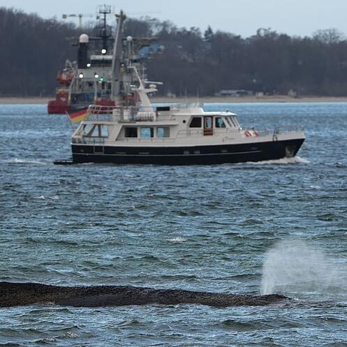 Ein erstes Foto zeige, wie sein Rücken in der Bucht aus dem Wasser der Ostsee herausragt. Ein Reporter der «Bild» bestätigt, dass er das Tier von der Seebrücke aus sehen könne.
