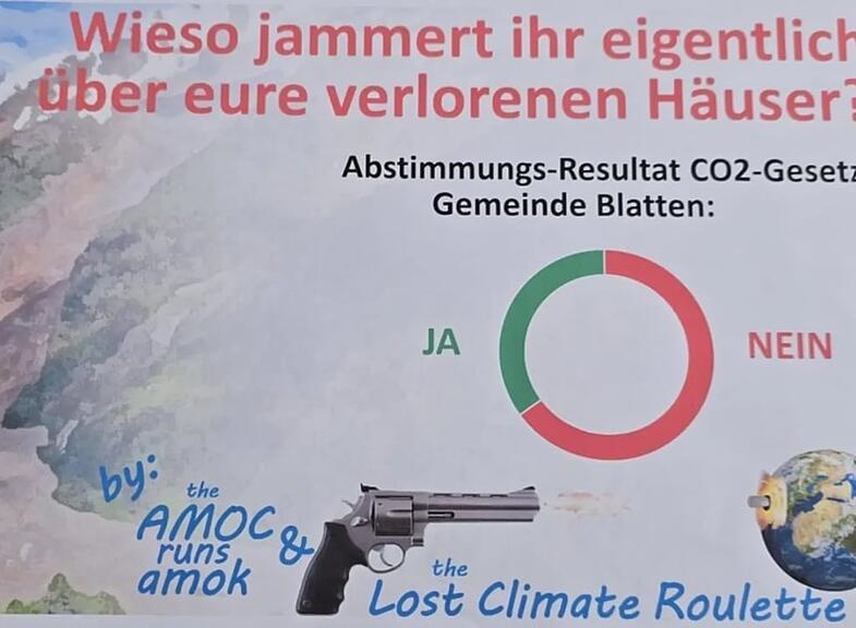 «Wieso jammert ihr eigentlich über eure verlorenen Häuser?», steht auf dem Flyer, den die Bewohnerinnen und Bewohner von Blatten am Samstag im Briefkasten vorfanden, wie der Walliser Bote berichtet. Darunter befindet eine Grafik zu den Abstimmungsergebnissen beim CO₂-Gesetz, das in Blatten 2021 mit 60 Prozent Nein-Stimmen verworfen wurde. Wesentlich knapper war es in der Gesamtschweiz, wo der Nein-Anteil 51,6 Prozent betrug.