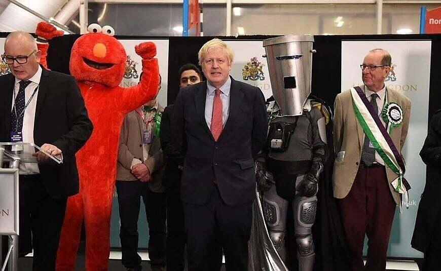Wie es die Tradition will, werden bei britischen Parlamentswahlen die Abstimmungsresultate jedes Wahlkreises live bekannt gegeben – und in Anwesenheit aller Kandidaten. Und so kann es passieren, dass der amtierende Premierminister des Vereinigten Königreichs von Grossbritannien und Nordirlands vor die Weltpresse treten muss, flankiert von Elmo aus der Sesamstrasse und einem intergalaktischen Superschurken mit einer Mülltonne auf dem Kopf.