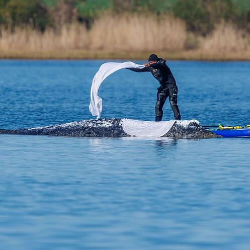 Mit der Verlegung des Wals in die Barge ging die Rettungsaktion am Dienstag in die entscheidende Phase. Mehrere Stunden lang hatten Helfer das Tier in eine eigens gebaggerte Rinne bugsiert. Mitglieder des Teams zogen den Wal mit Gurten zu der Barge. Um 14.45 Uhr war das Tier schliesslich in dem abgesenkten Kahn. Anschliessend wurde ein Netz aufgespannt, um zu verhindern, dass der Wal wieder herausschwimmt. Kleinere Boote schoben die Barge dann hinaus aus der Kirchsee in die Wismarbucht, wo sie vom Schlepper «Robin Hood» auf den Haken genommen wurde.