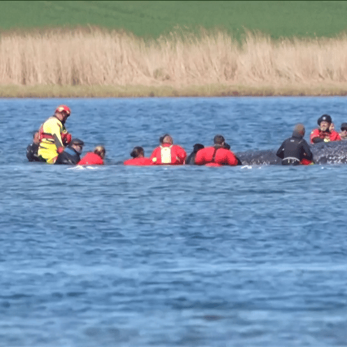 Schliesslich schwamm es in die Kirchsee genannte flache Bucht der Insel Poel. Dort strandete es erneut, schwamm sich zwischenzeitlich frei, lag aber wenige Stunden später am Ausgang der Bucht wieder fest. So kam es zu der nun laufenden Rettungsvariante. (dpa/watson)