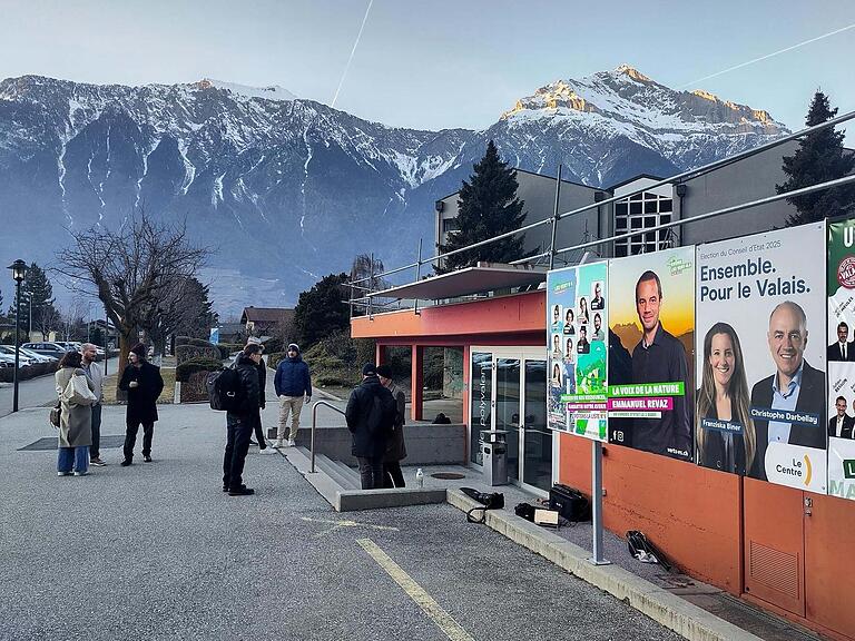 Christophe Darbellay spannt alle auf die Folter. Zahlreiche Journalistinnen und Journalisten sind am Sonntag extra ins Wallis gereist. Sie müssen derzeit draussen in der Kälte ausharren. Einlass in die wärmende Mehrzweckhalle gibt es noch nicht. (mg)