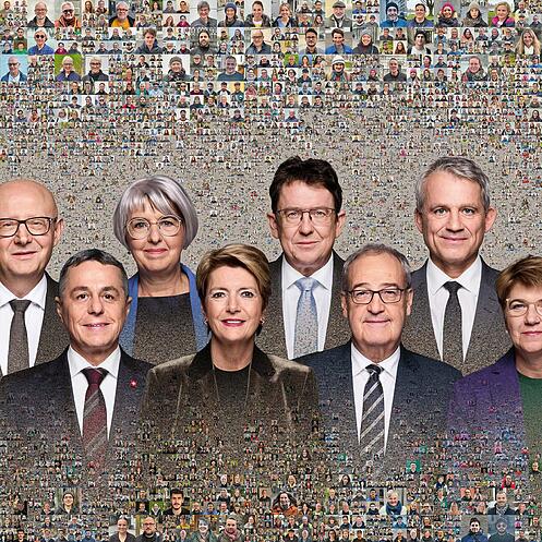Komposition und Sujet kommen für einmal sehr klassisch daher. Das Bild gewährt dennoch Einblicke: Wenig überraschend sitzt der neue Bundespräsident Guy Parmelin in der Mitte, flankiert von seinem Vize Ignazio Cassis. Die Konstellation wirft aber auch Fragen auf: Wieso dürfen die beiden jüngsten Mitglieder Beat Jans und Martin Pfister vorne sitzen? Auch Bundeskanzler Viktor Rossi nimmt viel Raum ein. Die beiden Frauen Karin Keller-Sutter und Elisabeth Baume-Schneider rücken zusammen mit Albert Rösti in den Hintergrund.