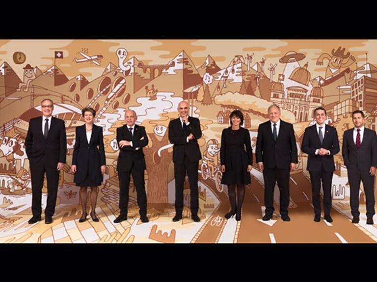 Das Konzept für das diesjährige Bundesratsfoto trägt den Namen "BUNDESART - Das kunstvolle Bundesratsfoto". Die sieben Bundesratsmitglieder und der Bundeskanzler seien vor einem Bild mit "Schweizer Sujets" zu sehen, die mit einem "Augenzwinkern" gezeichnet worden seien, schrieb die Bundeskanzlei.