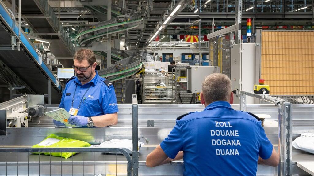 Zöllner nehmen verdächtige Sendungen vom Fliessband. Schwerpunktkontrolle des Bundesamts für Zoll und Grenzsicherheit (BAZG) im grenzüberschreitenden Online-Handel bei der Post im Briefzentrum Zürich-Mülligen, Schlieren.