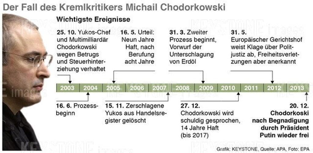 Putin hatte den früheren Ölmagnaten und Chef des inzwischen zerschlagenen russischen Öl-Konzerns Yukos am Freitag nach mehr als zehn Jahren Lagerhaft begnadigt. Chodorkowski wurde umgehend aus dem Gefängnis entlassen und reiste überraschend nach Berlin, wo er vom früheren deutschen Aussenminister Hans-Dietrich Genscher empfangen wurde. Am Sonntag will er sich in Berlin auf einer Medienkonferenz erstmals seit seiner Freilassung öffentlich äussern.