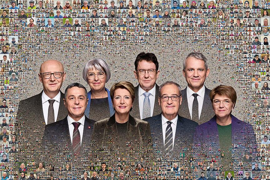 «Für das neue Bundesratsfoto ist (er) in der ganzen Schweiz herumgereist und hat Tausende von Personen angesprochen. In jedem Kanton hat er mindestens 40 Personen fotografiert, die bereit waren, mitzumachen. Aus den 1052 Porträts ist ein Mosaik entstanden, das mit den Porträts der sieben Bundesratsmitglieder und des Bundeskanzlers kombiniert wurde.» liest man in der Medienmitteilung zum Bundesratsfoto 2025.