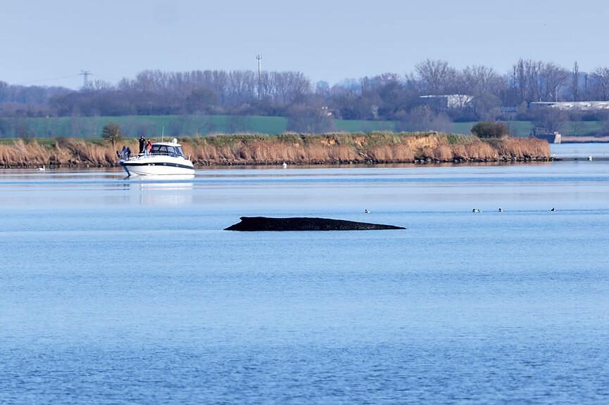 Auch ein Schlauchboot der Polizei war in der Nähe des Wals im Einsatz, wie ein dpa-Reporter vor Ort berichtete.