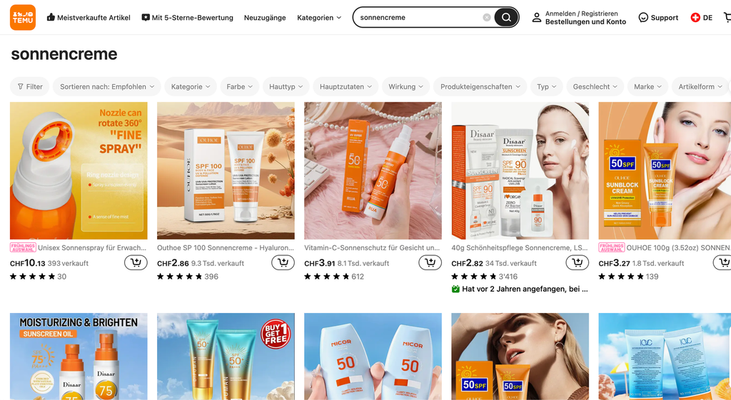 Der Kassensturz hat in seiner neusten Ausgabe sieben Sonnencremes vom chinesischen Billighändler Temu untersucht. Diese gibt es im Onlineshop zu Hauf, die meisten davon sind trotz hohem Lichtschutzfaktor spottbillig.