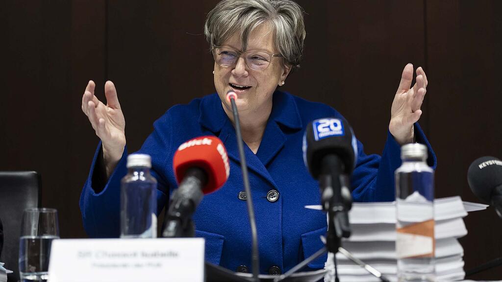 PUK-Präsidentin Isabelle Chassot präsentiert den rund 560 Seiten dicken Bericht zur CS-Rettung.