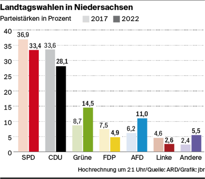 Die Sozialdemokratische Partei des deutschen Kanzlers Olaf Scholz hat bei der Landtagswahl im Bundesland Niedersachsen ein wenig Rückenwind erhalten, doch allzu viel sollte sie auf das Ergebnis wohl nicht geben: Rund 33 Prozent entschieden sich bei der Wahl in dem Acht-Millionen-Einwohner-Land für die SPD; das sind zwar weniger als vor fünf Jahren, doch Rang eins haben die Genossen verteidigt, zumal auch die Christdemokraten Wähleranteile verloren.