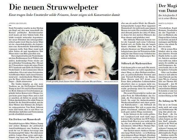 Vielleicht ist es ein Fortschritt, dass inzwischen mehr über Äusserlichkeiten von Männern als von Frauen gesprochen wird. In den Feuilletons sind seitenlange Abhandlungen über die Frisuren von Rechtspopulisten zu lesen, anlässlich der Wahlerfolge von Geert Wilders in Holland und von Javier Milei in Argentinien. Für den «Tages-Anzeiger» symbolisiert deren Mähne den «Anschein harmloser Verspieltheit», die NZZ erkennt darin ein «Zeichen von Manneskraft». Für diese wilden Theorien müssen auch gleich noch Trump und Boris Johnson ihren Kopf hinhalten.