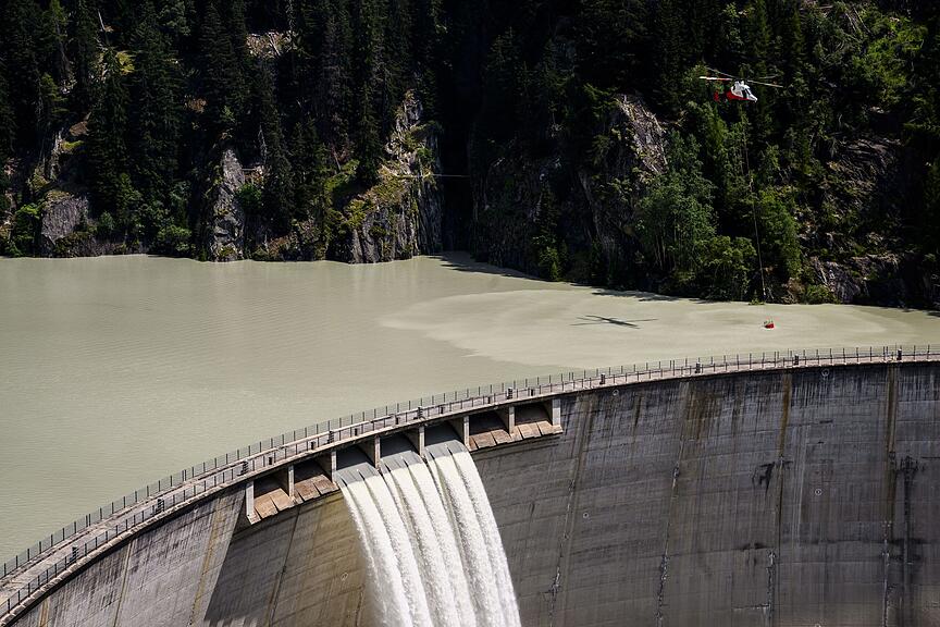 Das Wasser zur Brandbekämpfung aus der Luft entnehmen die Löschhelikopter entweder dem nahe gelegenen Stausee Gibidum (siehe Bild) oder den eigens für solche Fälle errichteten Waldbrandlöschbecken. Wo die Helikopter das Wasser holen, hängt von der Grösse des Helikopters ab.