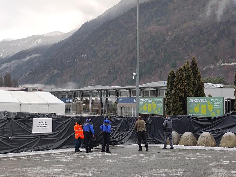 Dutzende Zivilschützer, Polizistinnen und Polizisten und Securitas-Beamte stehen vor der Expo in Martigny bereit. Das Gelände ist mit Eisengestellen und schwarzen Planen umrahmt - kein Durchkommen für Eindringlinge. Noch sind letzte Handgriffe nötig, bis alles sitzt: Unter anderem herrscht akute Ausrutschgefahr, mit kiloweise Salz kämpfen Helfer gegen den glatten Untergrund. Denn: Die ersten Gäste trudeln bereits ein und holen sich ihre Akkreditierung. (jus)